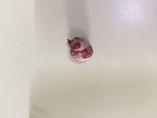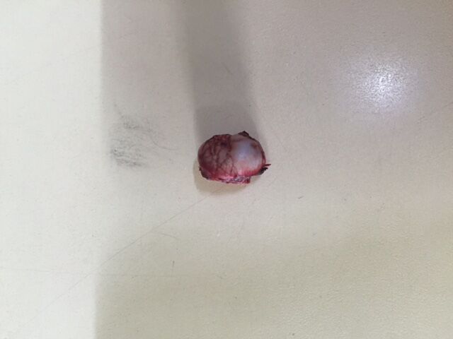 また、下の写真が切除した大腿骨頭の写真です。普通はつるつるした関節面なのですが、