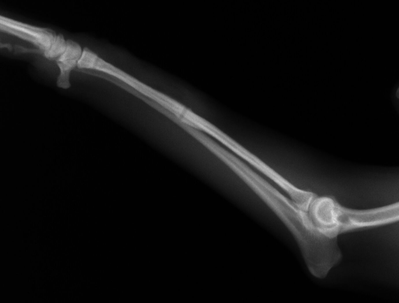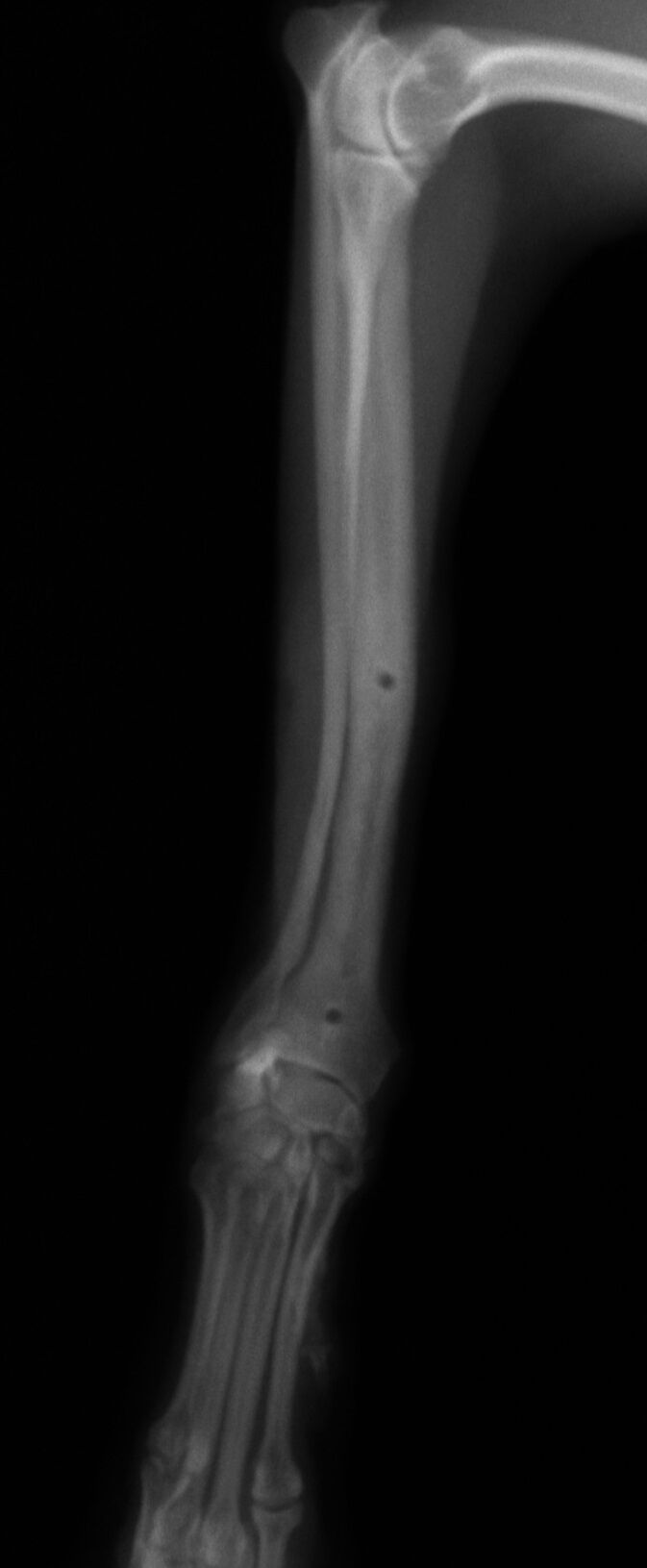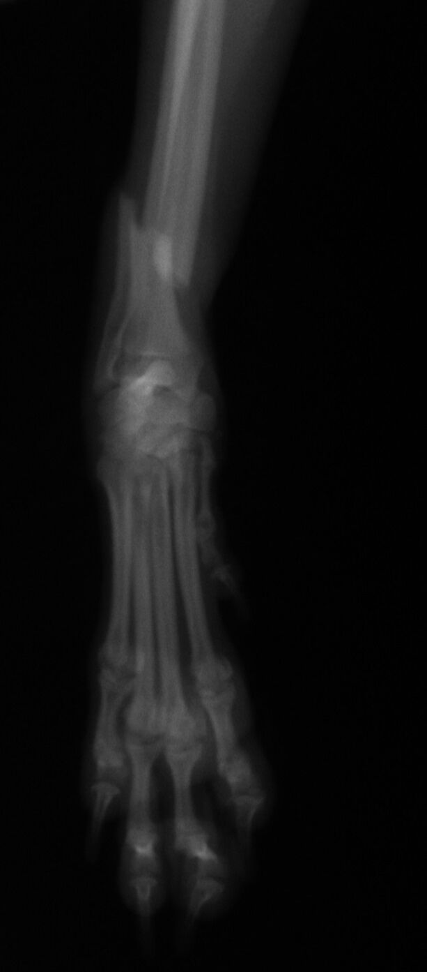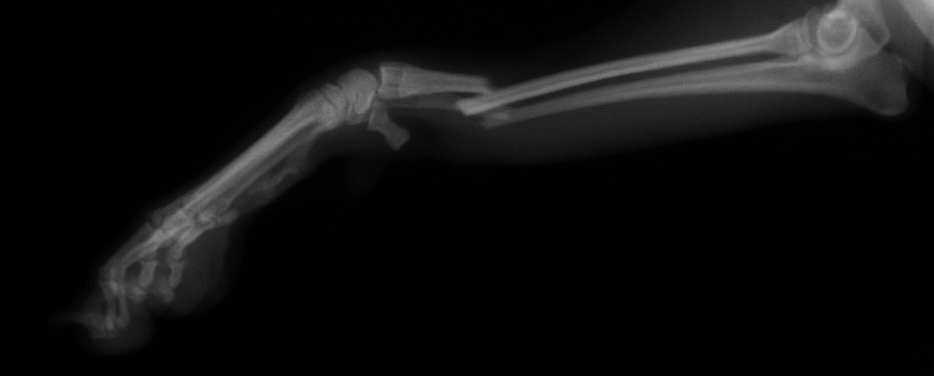 こんばんは、フジタどうぶつ病院です。今日はトイ・プードルの橈尺骨骨折の治療についてご報告させて頂きます。トイ・プードルは脚が長く、骨が細いので非常に骨折が多い犬種です。椅子やソファーから降りた時に折れたり、中には飼い主さんの後ろを歩いていて気づいたら脚を挙げていて病院でレントゲンを撮ったら折れていた、ということもあるようです。今回の症例報告のワンちゃんは椅子から降りた時に折れてしまったようです。下の写真が病院に来院時に撮ったレントゲン写真です。前脚の橈骨と尺骨が折れています。
