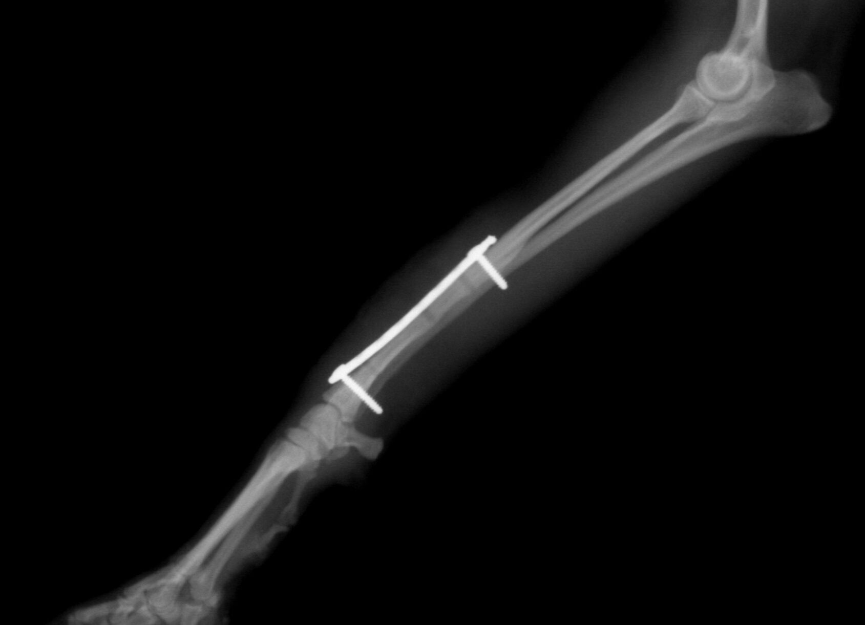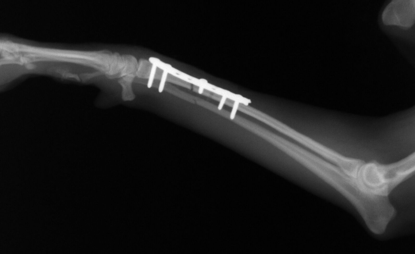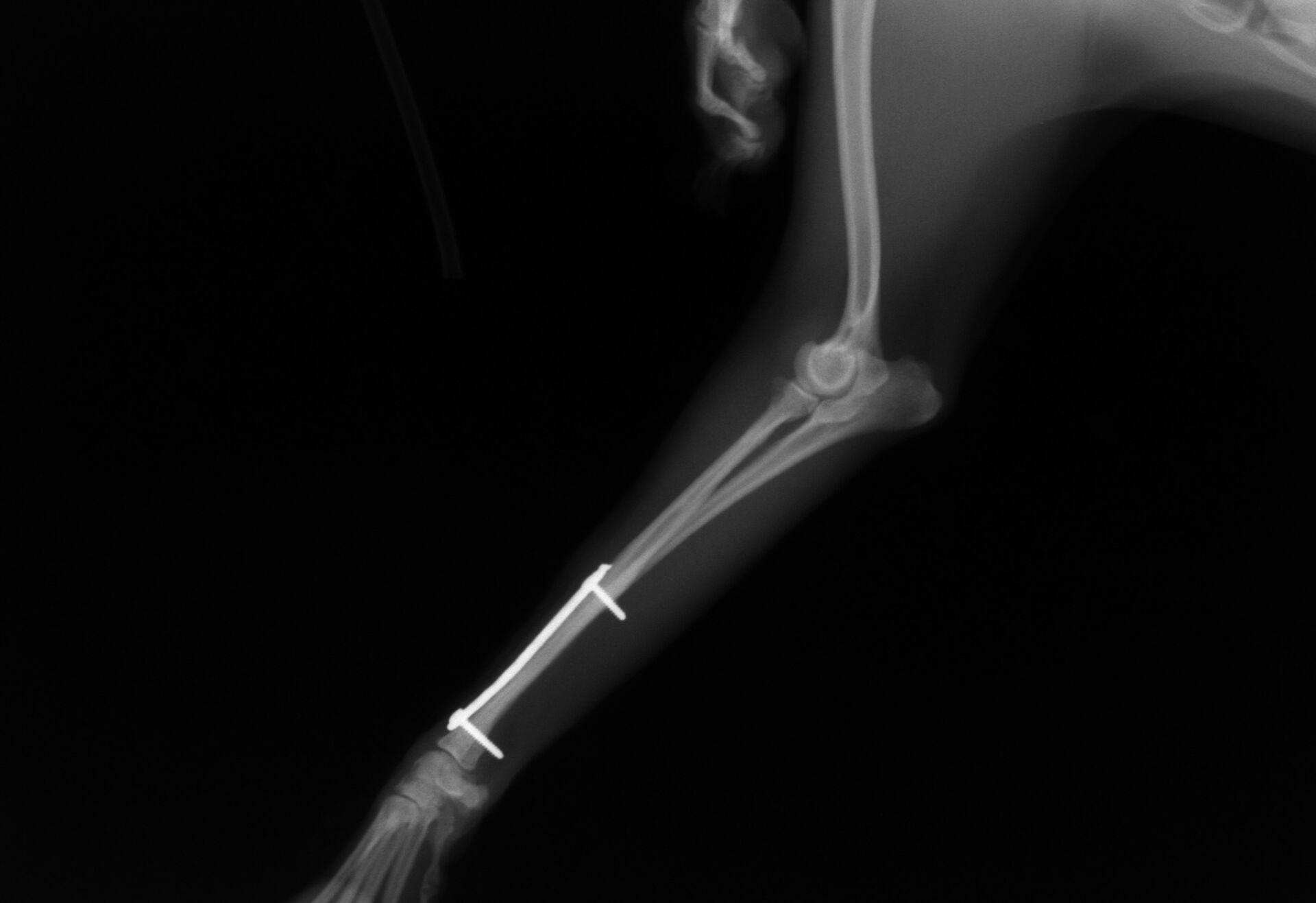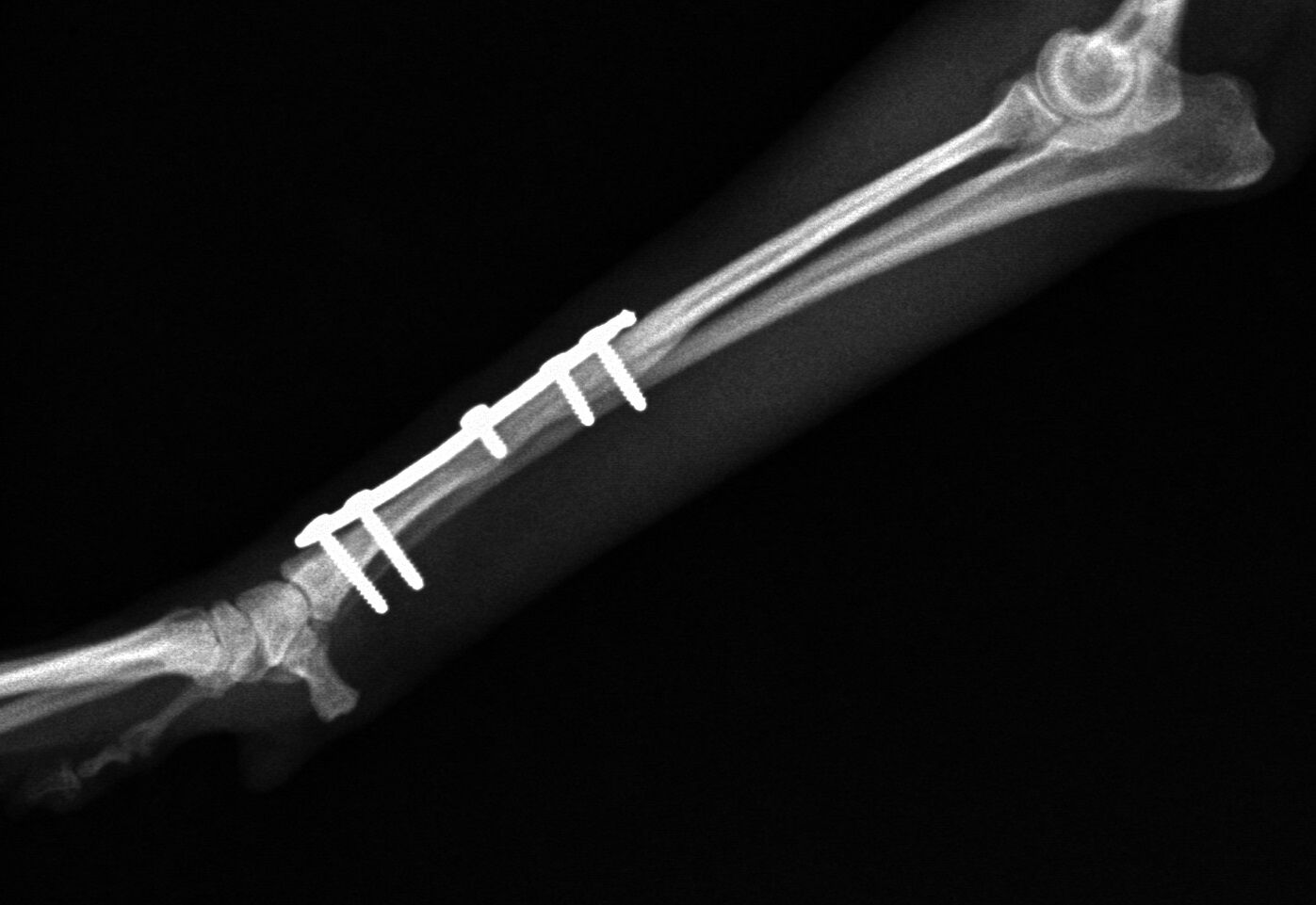 手術後1か月は外固定で補助します。その後、レントゲンで問題ないことを確認し外固定を外しました。外した後は普通に歩行し、散歩なども普段通りにしてもらいます。獣医師によってはプレートを残したままにすることがありますが、中にはプレート部分の骨が細くなってしまうことがあります。もし仮にプレートが折れてしまった時には大変な手術が必要になることがあります。当院では高齢犬であればプレートを残したままにするのですが、この症例は若かったので上記の心配もありますので、プレートを除去することにしました。ただトイ・プードルは骨の増生が良くないことが多いので、プレートを外した直後に再骨折したということがよくあります。ですので、当院ではプレートを留めているスクリューを段階的に外していきます。下の写真は手術後3か月の時に一部のスクリューを取った写真です。