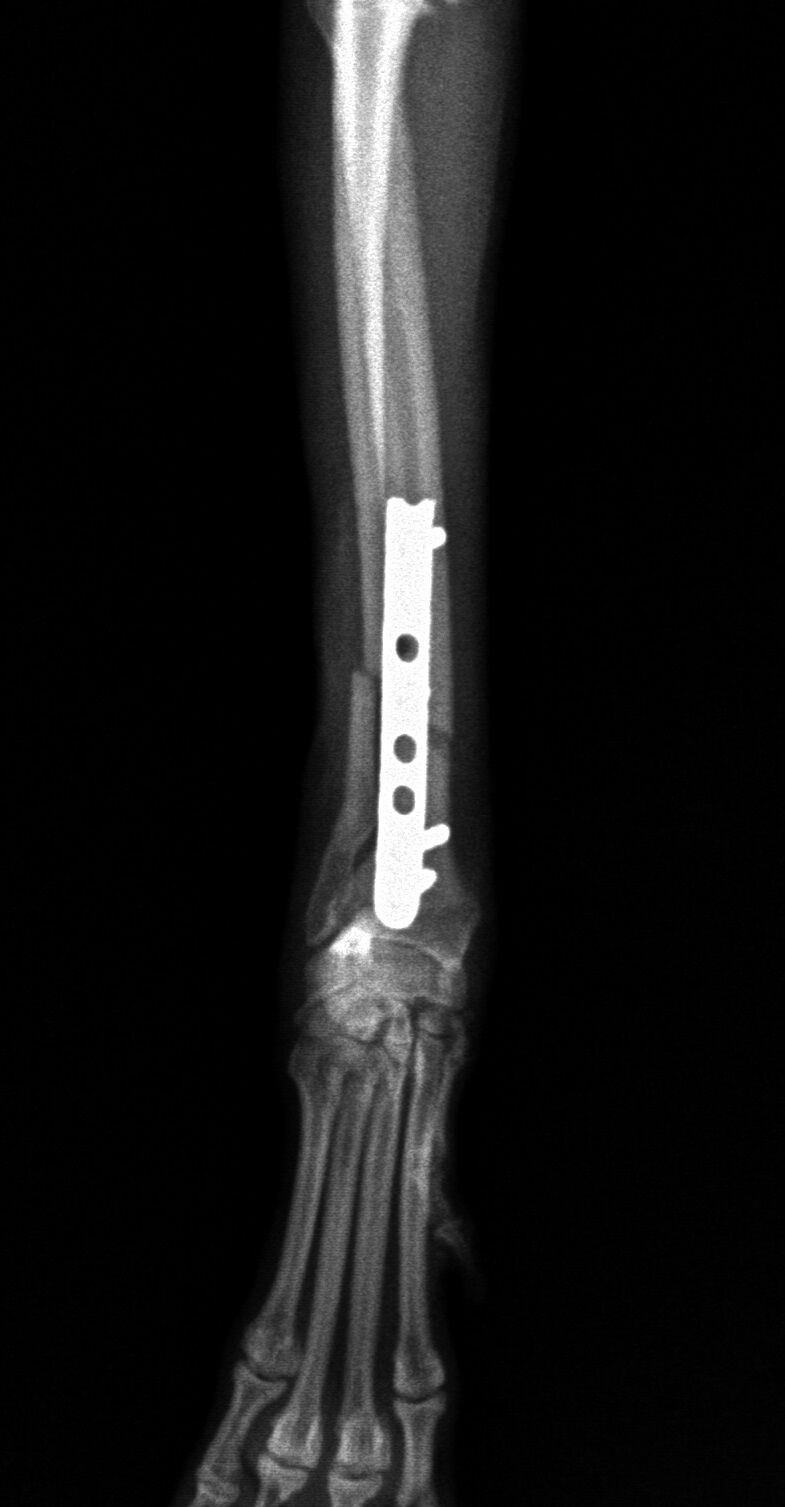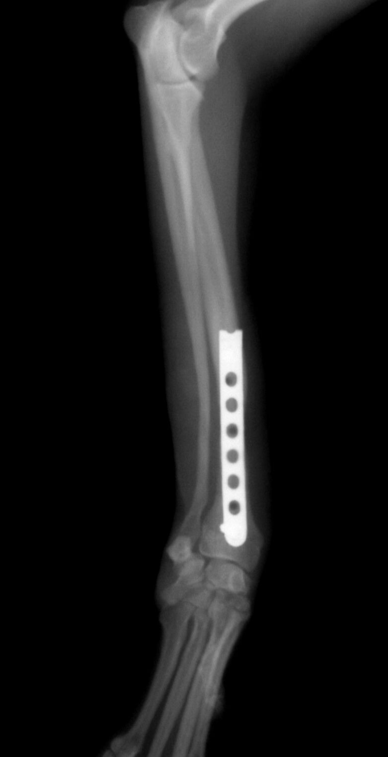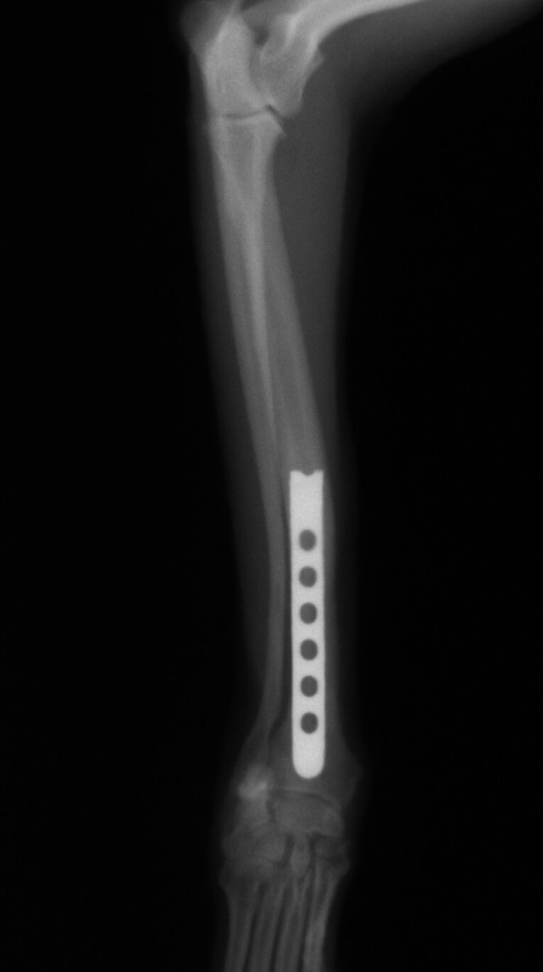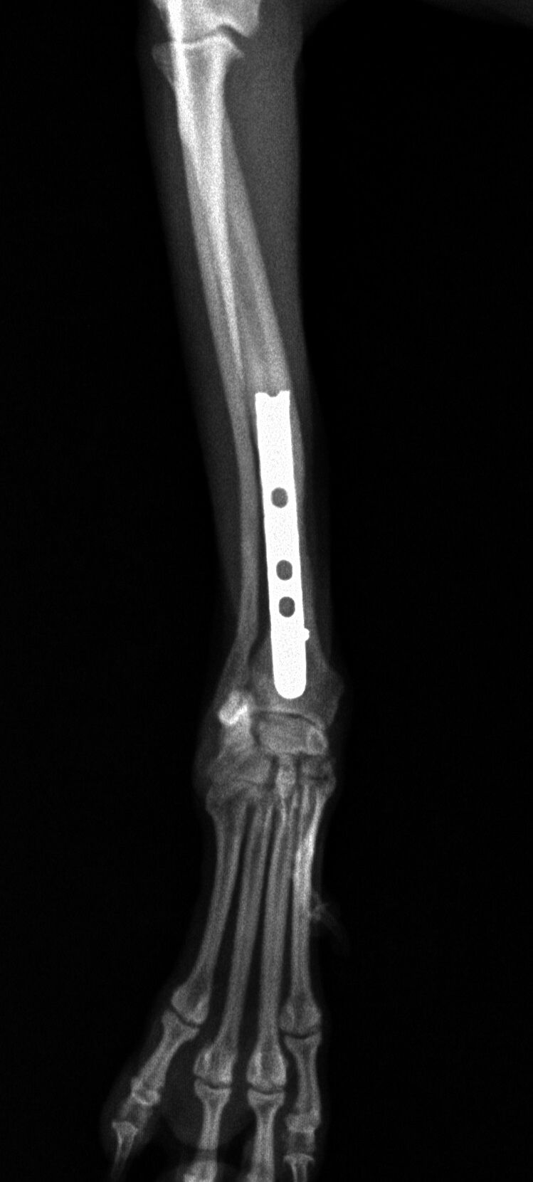 治療はプレートで固定する方法を行いました。骨折位置が橈骨先端に比較的近い位置だったことと、トイ・プードルは骨の増生が悪いことで有名なので少し気を遣う症例でした。プレートはステンレスプレートを用いました。手術直後が下の写真です。