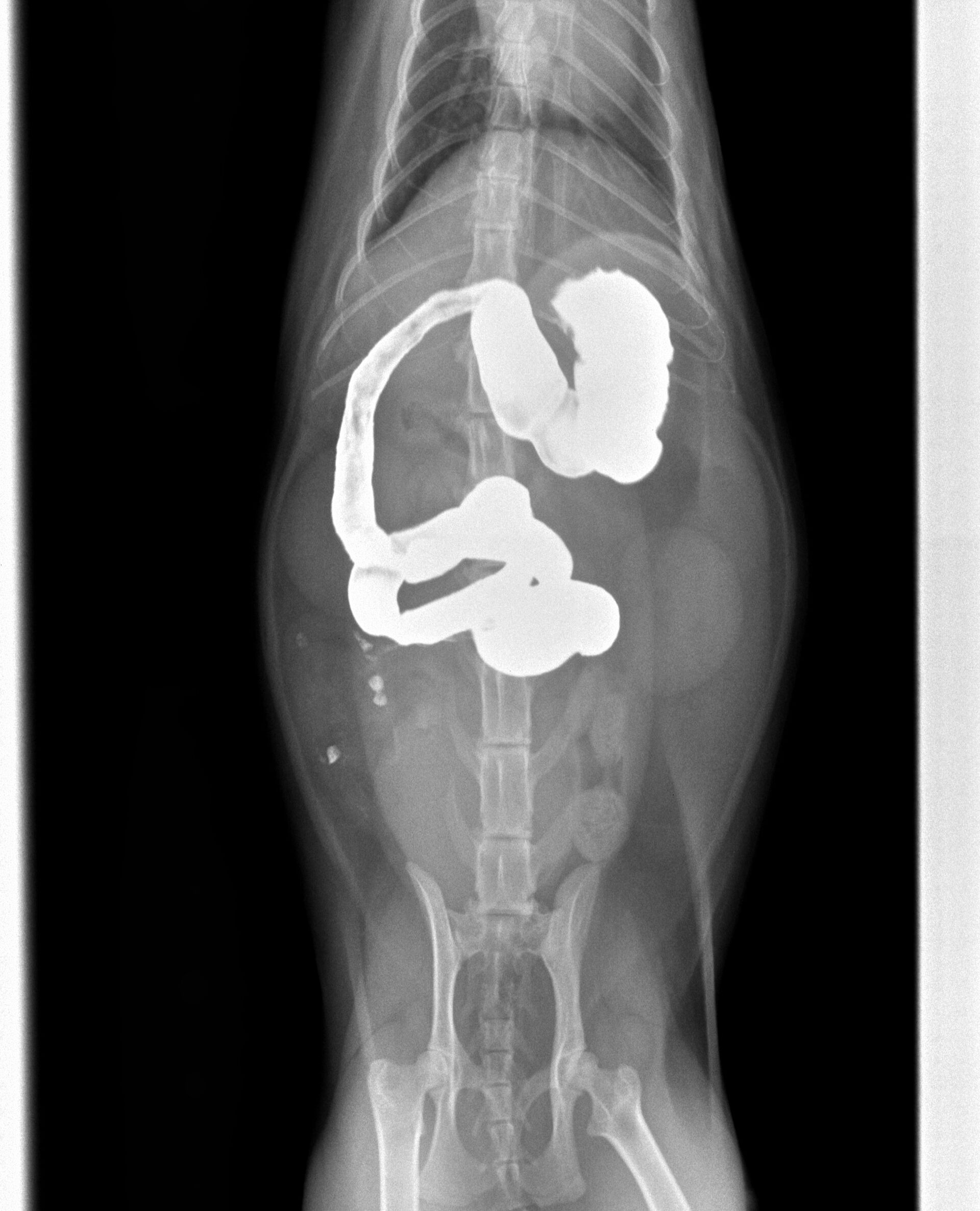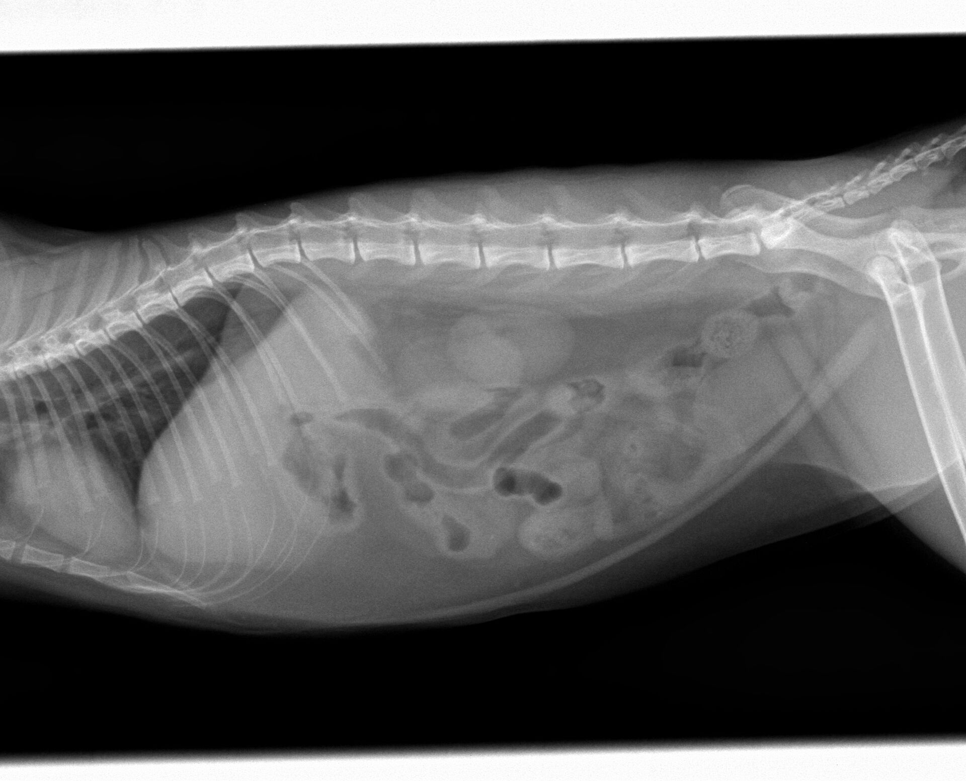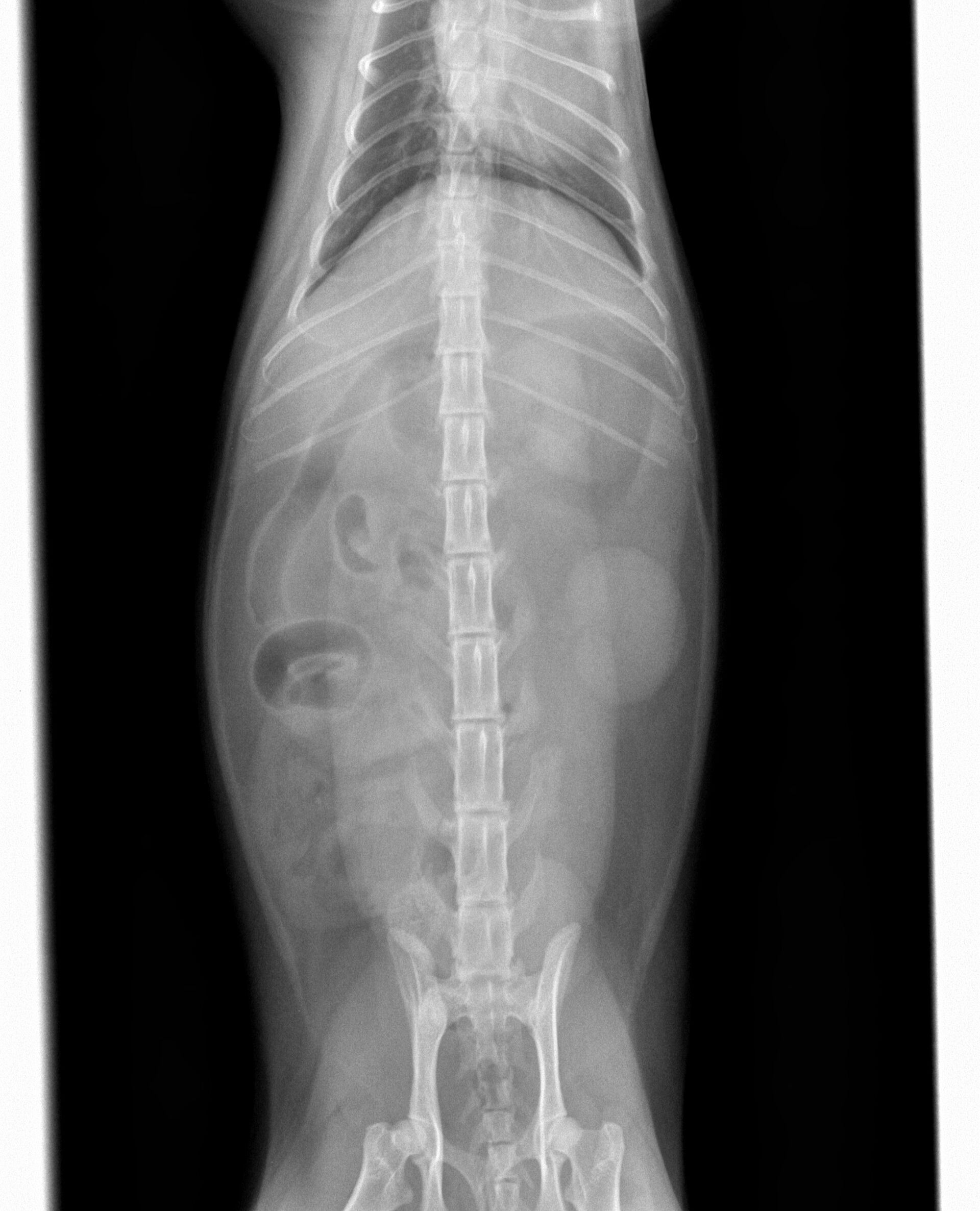 ある日突然食欲がなくなり、定期的に嘔吐するようになったとのことで来院しました。診察したところ、39度の微熱がある以外は脱水もなく、お腹を痛がったり、お腹に異物が触知されるということはありませんでした。また、飼い主さんに確認したところ、色々なものをかんだりすることがあるとのことでしたので、レントゲン撮影を行いました。その結果は特に異常は認められませんでした。
