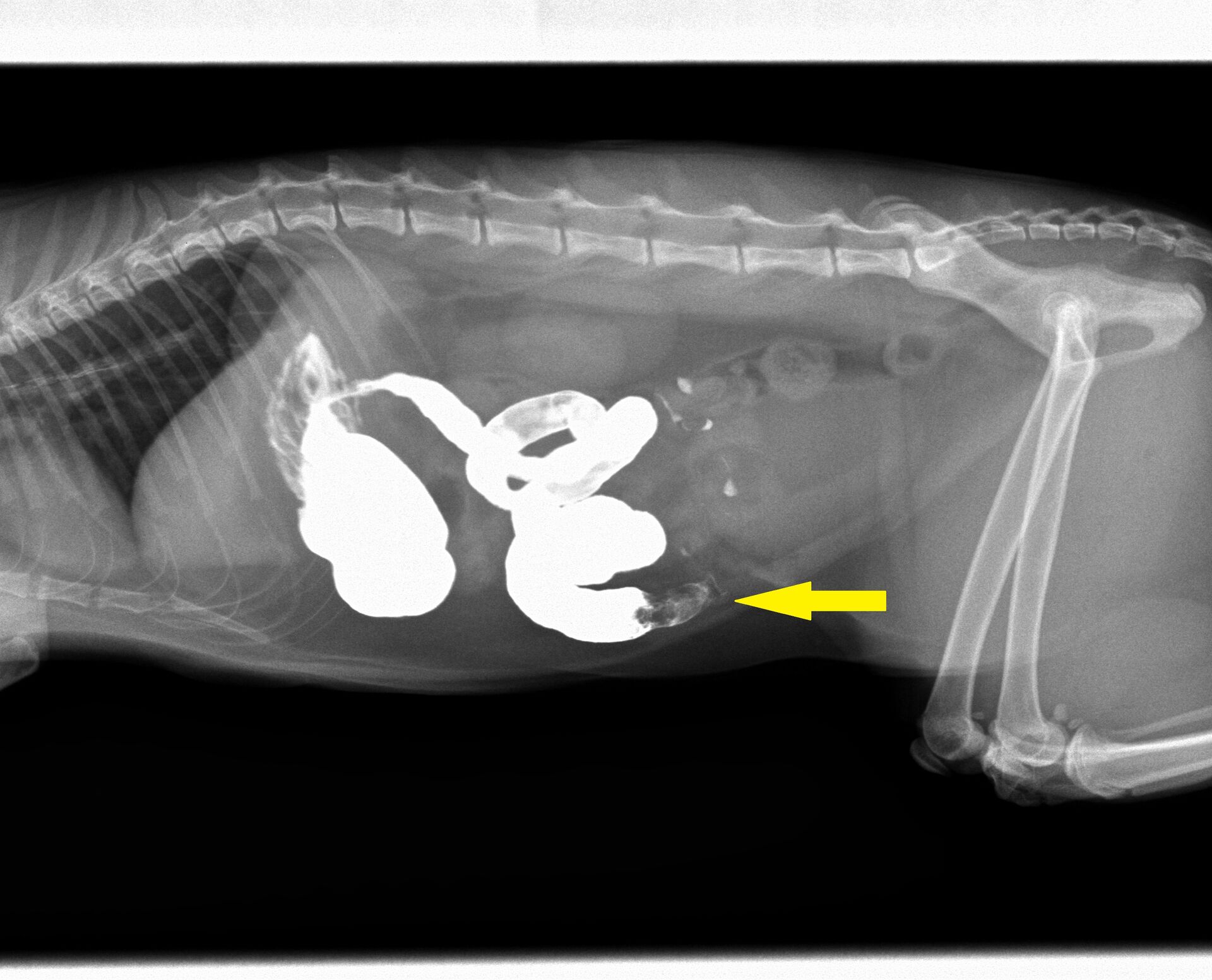 ところが、翌日また来院され、状態は全く変わらず、相変わらず食欲がなく、茶色のものを吐くようになったということでした。このことから腸閉塞を疑い、バリウム検査を行いました。バリウムを飲ませてから4時間目のレントゲンが下の写真ですが、小腸のある場所(黄色矢印)でバリウムが止まってしまい、それ以降は流れていません。胃内はバリウムで満たされています。通常は2-3時間で胃の中のバリウムはほとんどが流れ出てしまいます。