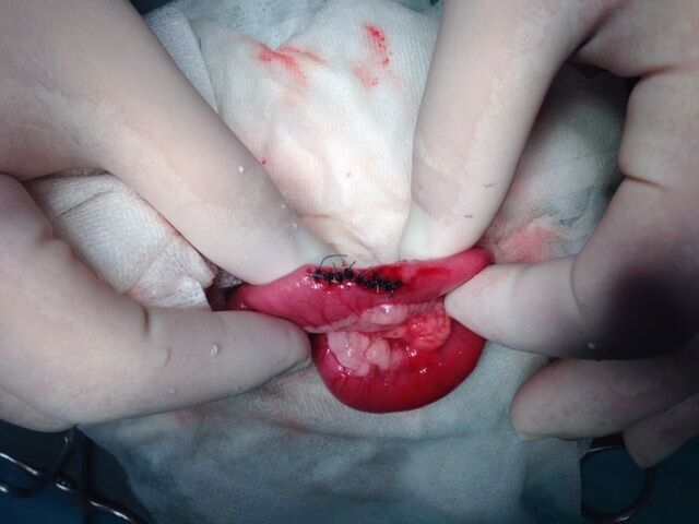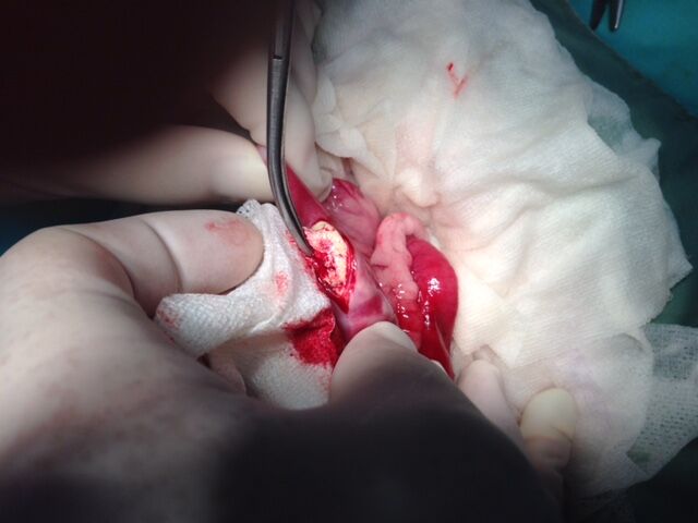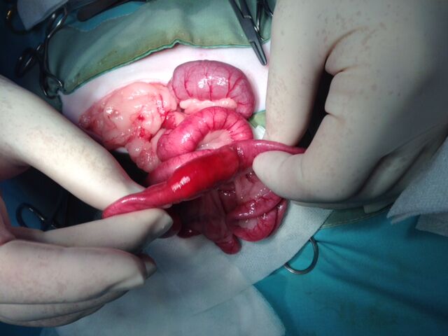 異物による腸閉塞が強く疑われたので、その日の夜に開腹手術行いました。その結果、小腸の一番細い部分である空回腸に異物が詰まっていました。その部分の腸を切開し、異物を取り出し、切開した部分を縫合して閉腹しました。異物はウレタンのようなもので、サンダルの一部ではないかということでした。