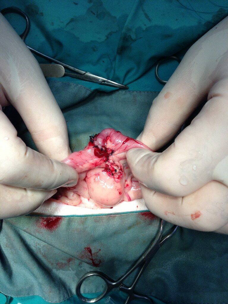 これは切除しないと大変なことになりますので、腫瘤の両端の正常な腸管も一緒に切り取り、正常な腸管の端と端と繋ぐ手術をする必要があります。結構な手術になってしまいました。